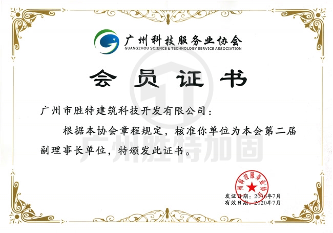 2016廣州科技服務業協會副理事長單位-廣州市勝特建筑科技開發有限公司企業榮譽展示。廣州勝特加固公司憑借專業的技術,獲得了多項榮譽認證.我公司有多年廠房加固工程經驗,專注于建筑結構加固改造,建筑改造施工,橋梁病害治理等工程設計及施工。