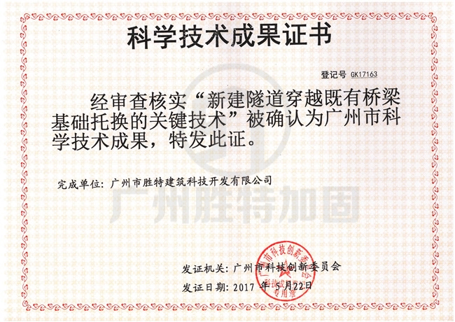 廣州市勝特建筑科技開發有限公司榮獲廣州市科學技術成果“新建隧道穿越既有橋梁基礎托換的關鍵技術”科技獎勵榮譽證書.