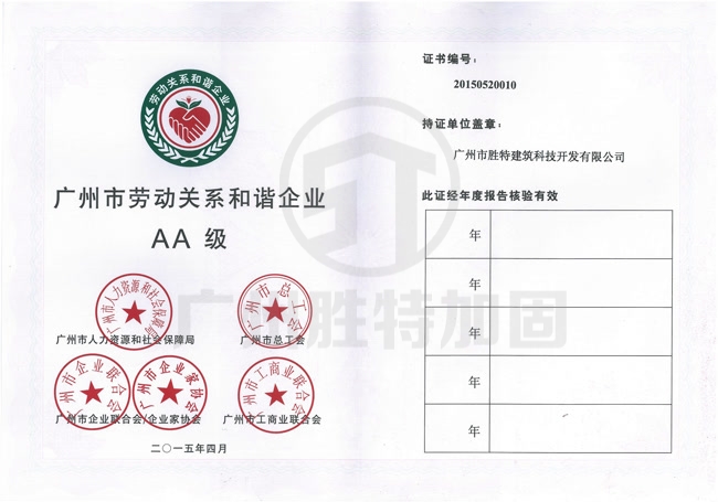 廣州市勝特建筑科技開發(fā)有限公司榮獲"廣州市勞動關(guān)系和諧企業(yè)AA級"榮譽證書