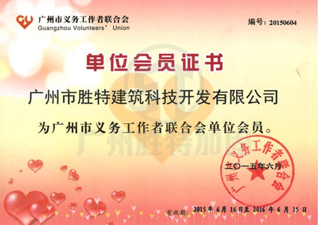 廣州市義務工作者聯合會會員單位-廣州市勝特建筑科技開發有限公司資質證書展示,勝特加固公司榮譽一覽.我司專注于建筑加固改造工程,廠房改造,電梯加固等工程設計及施工,擁有加固改造施工資質,特種專業工程資質等一系列特種工程資質.公司加固技術實力雄厚,獲國家高新技術企業認證!歡迎來電咨詢加固工程業務