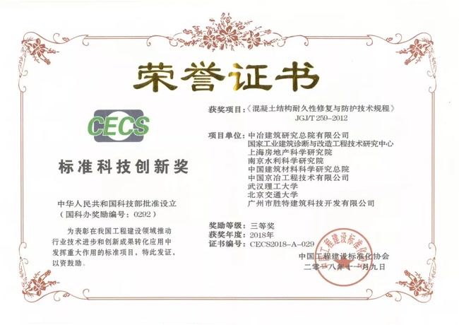 《混凝土結構耐久性修復與防護技術規程》榮獲2018年度標準科技創新獎三等獎