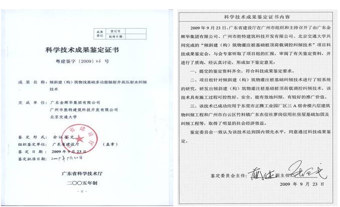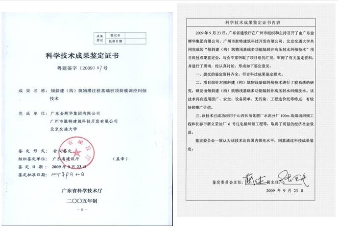 本技術于2009年9月23日榮獲廣東省建設廳鑒定的科技成果鑒定證書,鑒定結果為國內領先水平。本技術適用于具有灌注構筑物糾傾,糾傾時在相反一側設計斷樁區域調整千斤頂的升降迫使到糾傾目的。現已申請國家實用新型專利,且已成功應用于我司的東莞市正騰工業園廠區三A宿舍樓六層建筑物糾傾工程、廣州市農村信用聯社蘿崗信用社糾傾加固工程等。