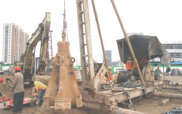 此地質入中風化標高較高,且中間有回填石或孤石等不確定因素,容易造成偏孔現象,應根據地質條件選擇先進的鉆孔設備,合理安排鉆孔順序,分組跳鉆,按技術規范操作。鉆孔時采取可靠的測量方法,嚴格控制鉆孔垂直度,可目測鋼絲繩在鉆孔提升時變化,也可采用經緯儀校正鉆桿垂直度。鉆進時,如鉆孔傾斜,掃孔糾正無效時,在孔內回填風化巖塊至偏孔處