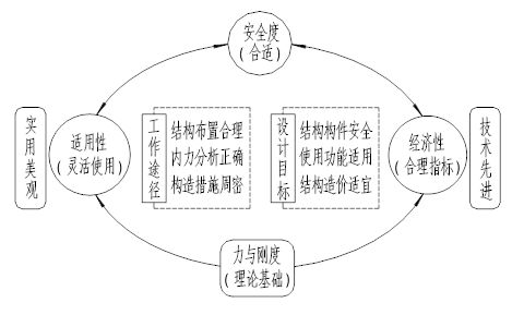 人們一談起結構設計,往往會產生第一個反應:“結構設計是否安全”,可見“安全”在結構設計中是處于何等重要地位。需要明確的是,保證結構安全確實是結構設計的首要任務,但并非是結構設計的唯一任務。必須強調的是,保證結構安全是對結構設計的最基本、最起碼要求,對于一項工程的結構設計來說,除“保證安全”這一最低要求外,還有其他許多內涵豐富的要求,也即通常所說的,結構設計做到安全只是初級階段的“行”,只有同時能滿足其他方面的要求,才算達到較高境界的“好”。“行”與“好”是兩個不同層次的概念。下圖中最上及左右共三個圓圈內的標注即是對結構設計全面要求的概括。這是結構設計必須優化和優化目標的最精練圖解示意。