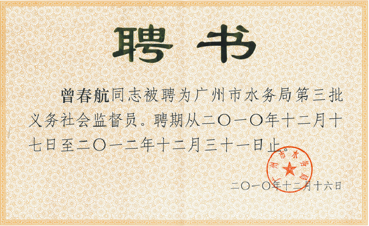 公司成立以來,不僅捐助大學生讀書、賑濟災區群眾、慰問貧困家庭,更重要的是不斷地致力于推動社會的公平發展。曾春航董事不顧公司工作繁忙,先后參加了廣州市的行風評議和白云區政協工作,在造就優秀企業的同時也為社會做出了獨特貢獻,本次又被廣州市水務局聘為3年期的社會監督員,這是勝特人服務社會、回報社會的佐證。