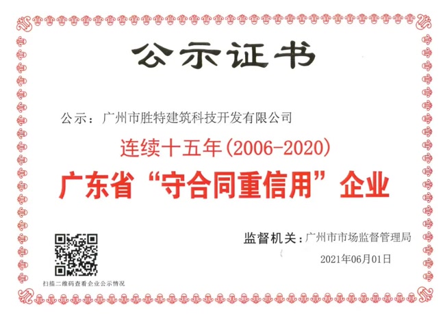 近日,廣東省市場監督管理局對2020年廣東省“守合同重信用企業”進行公示,廣州市勝特建筑科技開發有限公司(以下簡稱“我司”)順利通過了廣東省市場監督管理局的最終審查,這已是我司連續15年獲此殊榮。