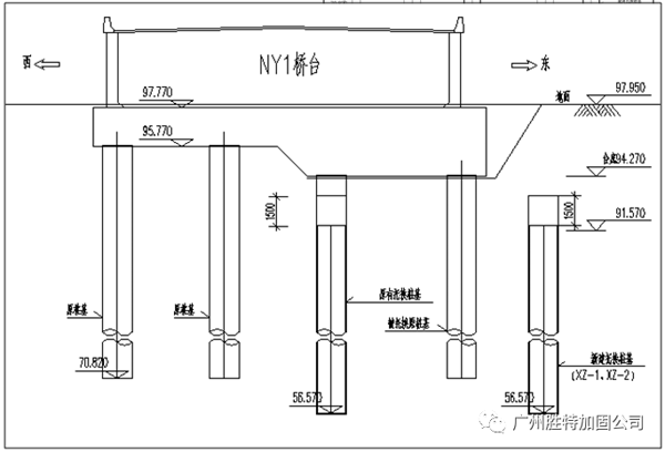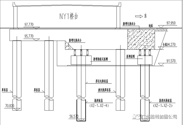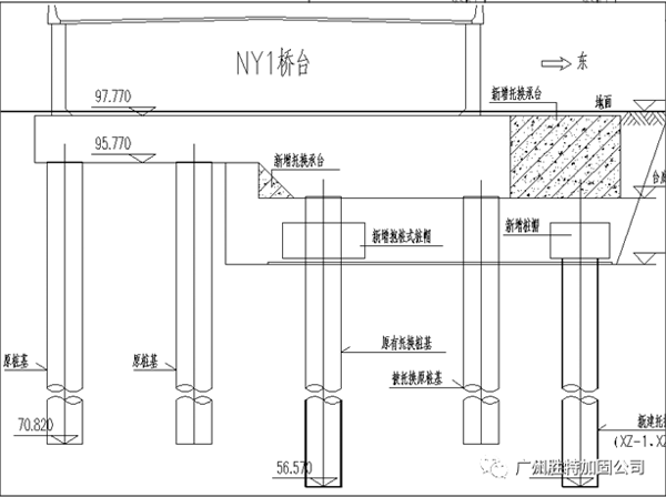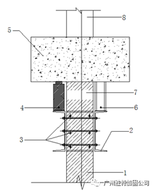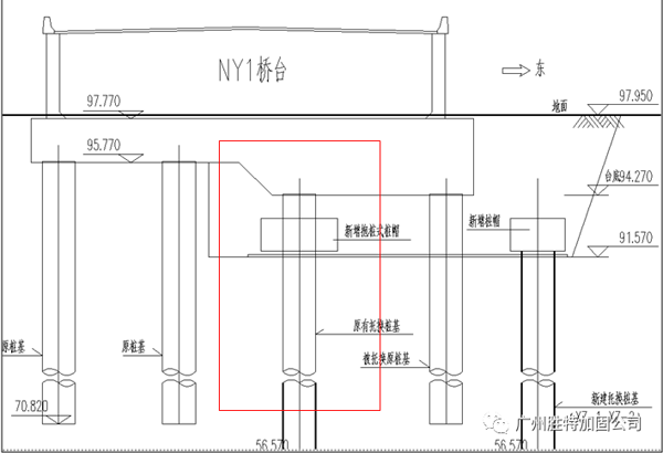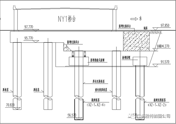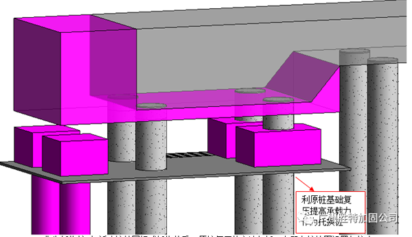 2、破除新樁基樁頭,新作抱樁式樁帽及新增樁帽,注意樁基聲測管和注漿管。
