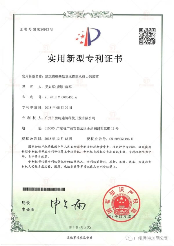 1. “建筑物樁基礎復壓提高承載力的裝置”(專利號ZL201820686436.4)