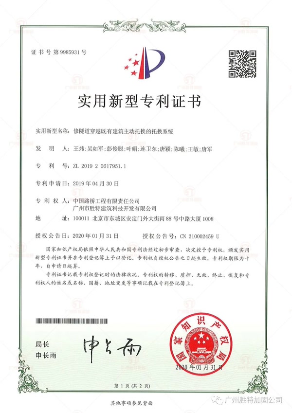 2. “新修隧道穿越既有建筑主動托換的托換系統”(專利號ZL201920617951.1)