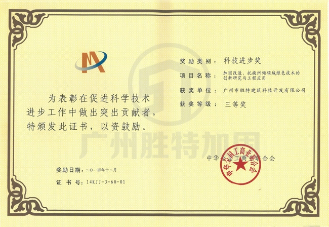 中華全國(guó)工商業(yè)聯(lián)合會(huì)科技進(jìn)步三等獎(jiǎng)-廣州市勝特建筑科技開(kāi)發(fā)有限公司企業(yè)榮譽(yù)展示。憑著“加固改造、托換糾傾領(lǐng)域綠色技術(shù)的創(chuàng)新研究與工程應(yīng)用”獲得中華全國(guó)工商業(yè)聯(lián)合會(huì)科技進(jìn)步三等獎(jiǎng),廣州加固公司憑借專業(yè)的技術(shù),獲得了多項(xiàng)榮譽(yù)認(rèn)證.我公司有多年加固工程經(jīng)驗(yàn),專注于樁基托換,教學(xué)樓加固,地基處理,煙囪加固等工程設(shè)計(jì)及施工。