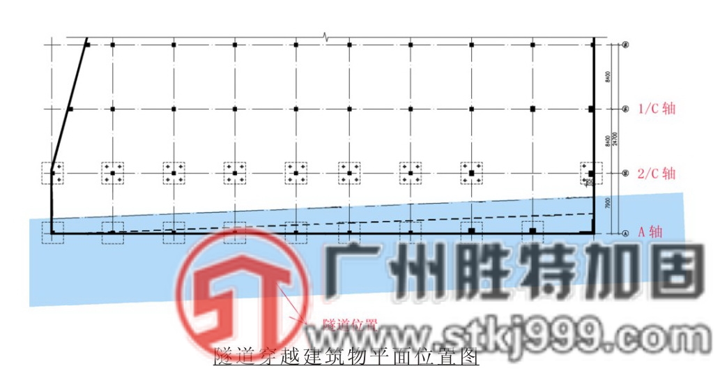 (1)在A軸與2/C軸之間設(shè)立新增托換柱(即在地下室對應(yīng)的隧道開挖邊緣位置新增嵌巖鋼管樁、承臺、托換柱);