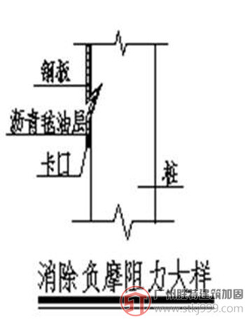 考慮到負摩阻力只發生在中段和上段兩截樁體,故對中段和上段兩截樁設置消除負摩阻力裝置。該裝置由鋼板與瀝青隔離層構成,樁體用鋼板包裹,鋼板與樁體之間設置3~5mm的氈油隔離層。鋼板下端加工成卡口狀,鋼板通過其卡口與樁身的卡口相互抵觸。當樁身相對于鋼板向下移動時,樁身卡口抵住鋼板卡口,帶動鋼板向下移動;當鋼板相對于樁身向下移動時,鋼板卡口便與樁身卡口脫離。若往后結構板下部地層發生沉陷,則鋼板卡口與樁身卡口脫開而自由下沉。由于鋼板與樁之間涂有氈油隔離層,樁側的摩阻力即可得到消除。為了節省鋼板材料,每截樁上的鋼板可以分段設置,每段鋼板下端都有卡口與樁身上的預埋卡口相互抵觸。上、下兩段鋼板之間應留有間隙,間隙的大小可按上、下兩段土層的平均沉降量之差進行估計,自上到下各段鋼板之間間隙因符合地層沉陷上大下小的規律。鋼板的厚度和卡口強度必須滿足壓樁時樁身帶動鋼板下沉所產生的拉力和剪力。