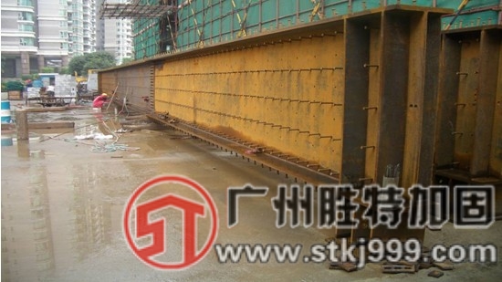 位于廣州越秀區西湖路63號的光明廣場,經營單位需將第七層中廳改造為電影院使用。為滿足其功能使用荷載要求,需對原結構承載力不足的進行梁加固補強。由于條件限制,對第七層承載力不足的原梁加固施工僅能在其樓板面上進行,且因為跨度較大,根據設計計算,梁端彎矩剪力都比較大,經營單位要求盡量減少新增加固構件高度以滿足實際使用層高需要。