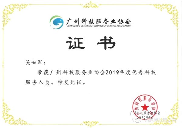熱烈祝賀我司吳如軍董事長榮獲廣州科技服務協會2019年度優秀科技服務人員稱號!“廣州優秀科技服務人員”由市政府委托科技局組織評審指標主要是專業服務水平、 2019年度服務業績、誠信服務等3個一級指標,今年獲選名額5名,評審采取定性評審方法,由3位專家進行評審,各分值匯總、平均后由高到低分排序,最終選取前五名作為評審推薦名單上報市政府批準。