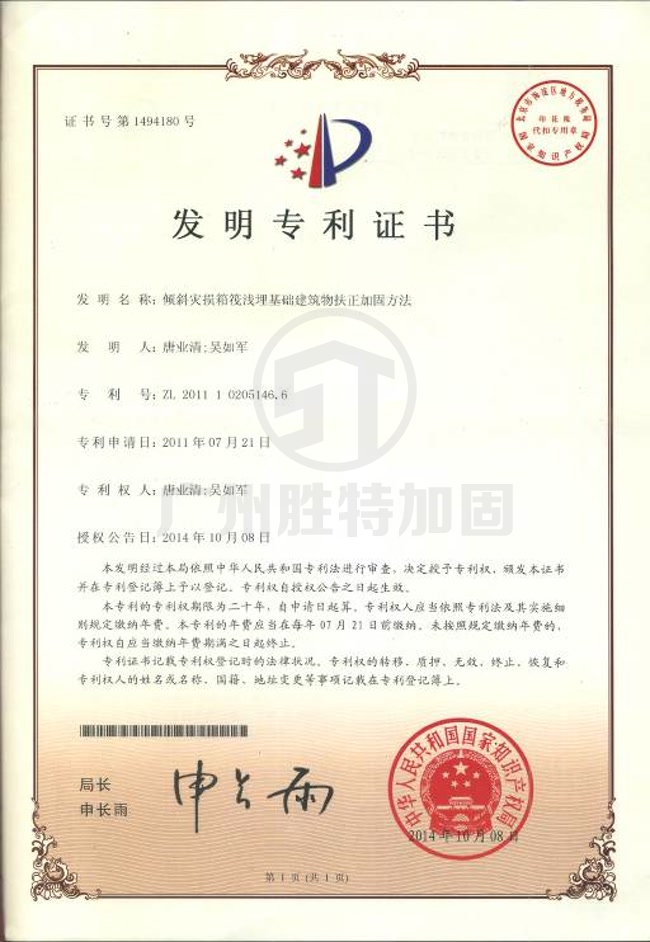 傾斜災損箱筏淺埋基礎建筑物扶正加固方法-廣州市勝特建筑科技開發有限公司加固專利技術、專利證書展示,科技成果展示.我司專注于等建筑糾傾,扶正加固工程設計及施工,多年來申請了多種特種工程技術專利.公司加固技術實力雄厚,獲國家高新技術企業認證!歡迎廣大客戶來電咨詢或到我司考察.