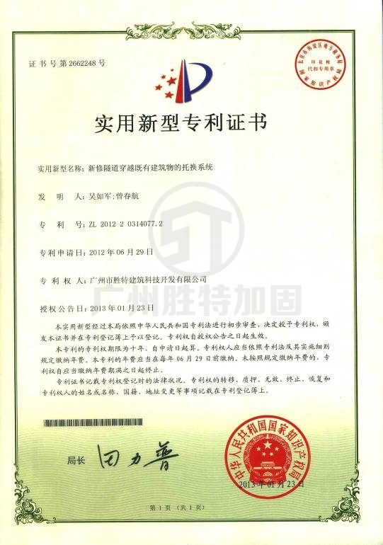 新修隧道穿越既有建筑物的托換系統(tǒng)(專利號ZL201220314077.2)-廣州市勝特建筑科技開發(fā)有限公司加固專利技術(shù)、專利證書展示,科技成果展示.我司專注于地基基礎(chǔ)加固,擋土墻加固工程等工程設(shè)計及施工,多年來申請了多種特種工程技術(shù)專利.公司加固技術(shù)實力雄厚,獲國家高新技術(shù)企業(yè)認證!歡迎廣大客戶來電咨詢或到我司考察.