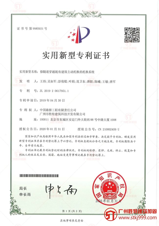 我司實用新型專利證書《修隧道穿越既有建筑主動托換的托換系統》