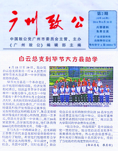 “致力興邦,助學興國”是中國致公黨一貫的宗旨,致公黨廣州市白云總支多年來秉承優良傳統,熱心社會公益事業,多年來對口幫扶數十名貧困學生,得到了當地政府的高度贊揚和肯定。