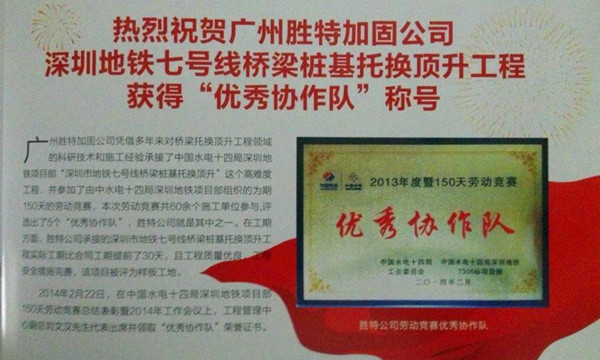 廣州勝特加固公司憑借多年來對橋梁托換頂升工程領(lǐng)域的科研技術(shù)和施工經(jīng)驗承接了中國水電十四局深圳地鐵項目部“深圳市地鐵七號線橋梁樁基托換頂升”這個高難度工程。并參加了由中水電十四局深圳地鐵項目部組織的為期150天的勞動競賽,本次勞動競賽共60余個施工單位參與,評選出5個“優(yōu)秀協(xié)作隊”,勝特公司就是其中之一。在工期方面,勝特公司承建的深圳市地鐵七號線橋梁樁基托換頂升工程實際工期比合同工期提前了30天,且工程質(zhì)量優(yōu)良,工程安全措施完善,該項目被評為樣板工地。