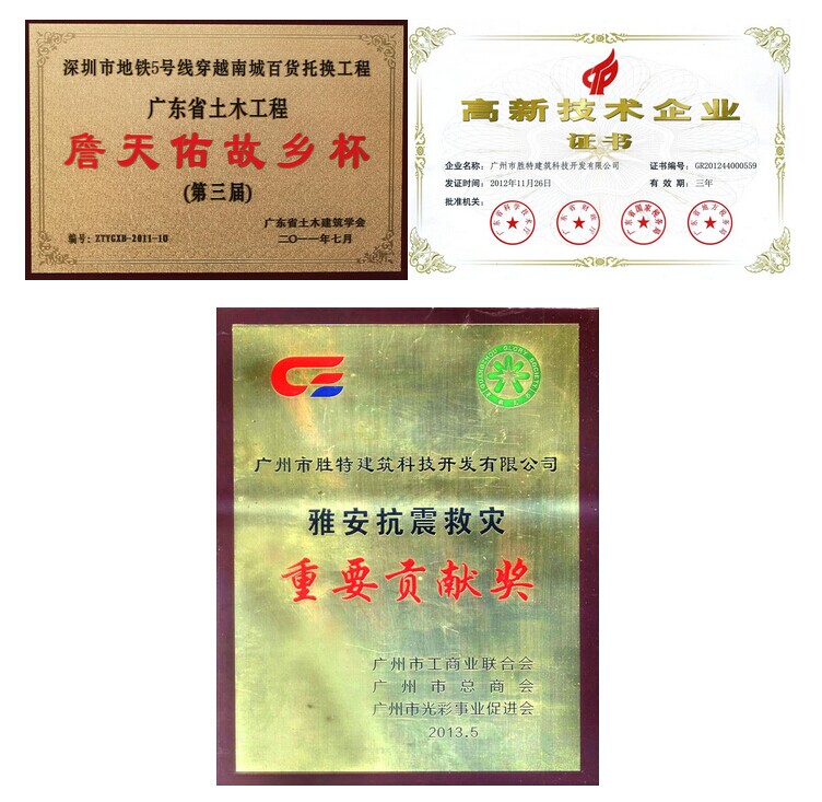 2012年,勝特公司被廣東省科技廳授予“高新技術(shù)企業(yè)”稱號,公司成為廣東省唯一一家加固改造行業(yè)的高新技術(shù)企業(yè),也是全國同行僅有的三家高新技術(shù)企業(yè)之一。