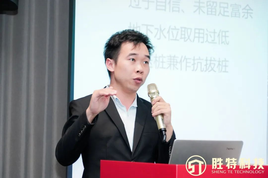 緊接著,技術服務中心結構工程師盧新發分享了既有建筑群抗浮處理加固設計的研究。他通過多個地下室上浮加固實際案例,講述了地下室上浮變化對建筑結構的危害,提出5個造成地下室上浮的原因,并給出抗浮錨桿法、抗拔樁、注漿加固法等加固抗浮措施,特別指出,抗浮設計不僅要考慮結構的安全性,還需兼顧經濟性和施工可行性。
