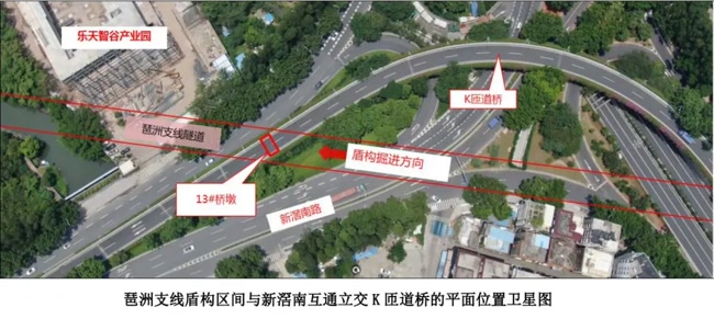 新建穗莞深城際琶洲支線是省重點工程,本標段線路自廣佛環線東環的琶洲站引出,沿會展四路下方向南前行,下穿黃埔涌后向東南方向延伸,途經新滘東路與科韻路路口、環城高速、萬畝果園、官洲河后到達貝崗公園明挖段,再從貝崗公園明挖段大里程方向引出,下穿江樂海、新化快速、深井村后,到達黃埔區長洲街道金州南路東側的大學城東站。其中,13.65m 大盾構區間在DK1+400~+650 間下穿科韻路南延長線新滘南互通立交 K 匝道橋,該匝道橋 13#墩 2 根直徑 1200mm 的樁基在隧道范圍內,故對 13#墩進行樁基托換處理。