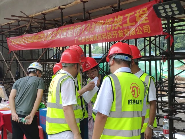 2022年7月24日上午9:00,我司現場管理人員、技術人員、施工人員都在自己的工作崗位上做好頂升準備,中鐵隧道股份有限公司領導、監理、相關工作人員等也到達現場進行監督和檢測。隨著我司項目負責人何茂總一聲令下,托換頂升正式開始。中鐵隧道股份有限公司和我司的領導及工作人員頂著39°的高溫酷暑,仍全神貫注地投入到頂升工作中,認真監督、查看,并做好各項儀器設備數值的登記,在雙方領導及工作人員的共同努力下,《廣州市海珠區科韻路新滘東路立交匝道橋13# 墩托換工程》于2022年7月24日下午14:00順利頂升完成。