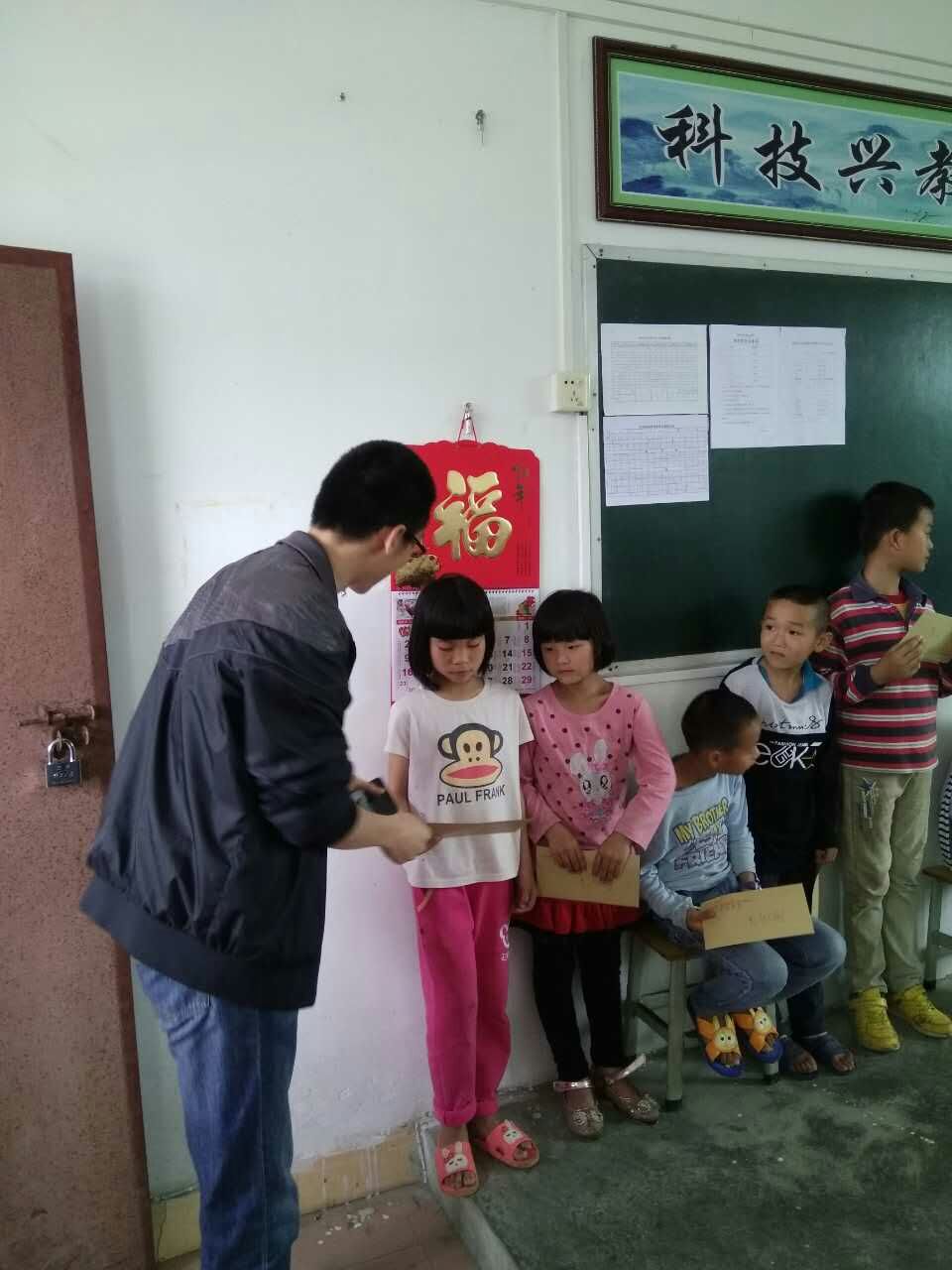 張主任代表廣州勝特加固公司向沙坪小學學生頒發慰問金