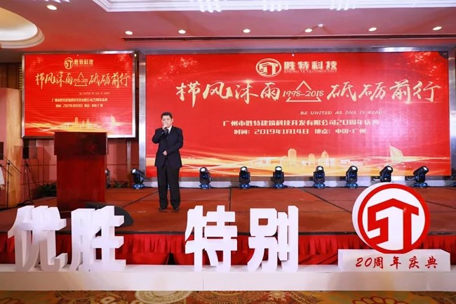 伴隨著冬日的暖陽,2019年1月14日,勝特科技20周年慶典,在廣東亞洲國際大酒店8樓會議廳隆重舉行。參加本次盛典的嘉賓包括省、市、區領導代表及建筑界的精英、行業前輩、專家、學者以及來自全國各地的嘉賓、勝特和勝力全體員工共約400余位。