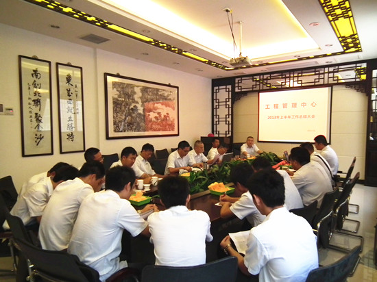 會議在工程管理中心副總經理先生的主持下有條不紊的進行著,唐軍先生首先給2013年1-6月份工程管理中心工作作出總結,全體工程管理中心的技術骨干和各級管理人員聚集在一起,開展了現場技術交流,管理學習,年中總結的一系列活動。常務副總先生、董事長吳如軍先生相繼發言,對安全施工、建立工程施工對外的形象與品牌樹立提出相關要求。