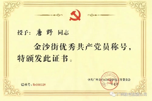 近日,我司黨支部書記、工會主席唐野同志被中共廣州市白云區金沙街工作委員會評為“優秀共產黨員”。