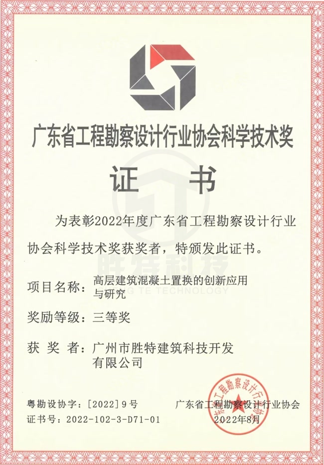 2022年度我司申報的“高層建筑混凝土置換的創新應用與研究”項目榮獲廣東省工程勘察設計行業協會科學技術獎三等獎。