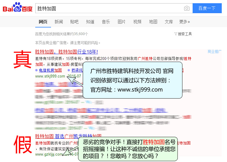 最近有客戶給小編打電話,第一句話就是:你是真的勝特還是假的勝特啊?小編莫名其妙了半天,最后通過了解,才知道客戶在網(wǎng)上找了半天,發(fā)現(xiàn)多個打著“勝特加固”的名義在百度上推廣。咨詢了好幾個公司都覺得不靠譜,好不容易找到咱們這邊來了。通過客戶這樣一說,小編懷著忐忑不安的心情到百度上一搜!果然!!!!!!莆田醫(yī)療事件之后,“百毒”再一次把加固行業(yè)推向浪尖~對于這種不誠信的單位,客戶您怎么看???連自己的門面都拿不出了,你還相信他能給你拿真材實料做工程?再一次重復(fù)一遍,怎樣找到勝特公司的官網(wǎng)?溫馨提醒完畢,那怎樣通過其他方式來辨別勝特公司呢?