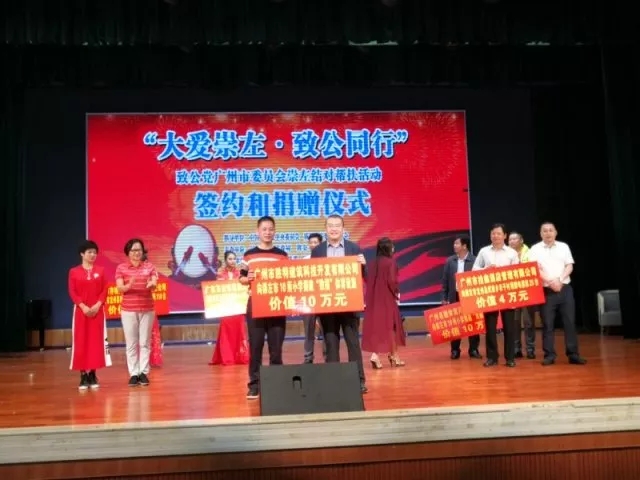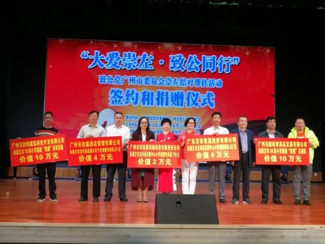 2017年10月20日,“大愛崇左·致公同行”結對幫扶活動簽約和捐贈儀式在廣西民族師范學院舉行。致公黨廣州市委會與崇左市相關領導舉行幫扶活動項目簽約捐贈儀式,計劃三年內捐贈款物約68萬元,主要涉及一批幼師教育培訓、電商培訓、電子閱覽室建設等幫扶項目。
