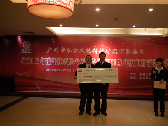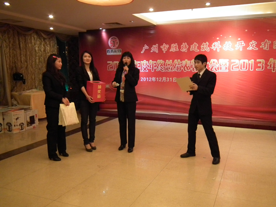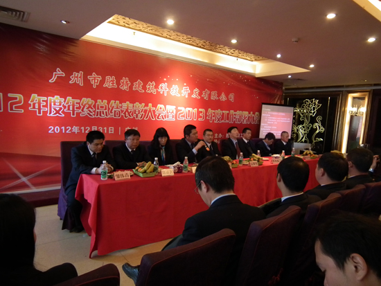 2012年12月31日,公司2012年度年終總結(jié)表彰大會(huì)暨2013年度工作部署大會(huì)在金匯景海鮮大酒樓勝利召開(kāi),參會(huì)人員包括勝特加固公司全體員工及員工家屬,共計(jì)150余人。