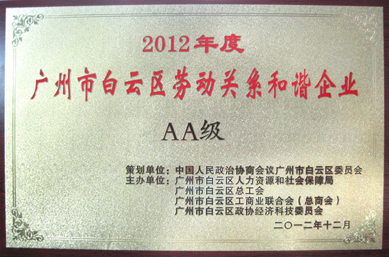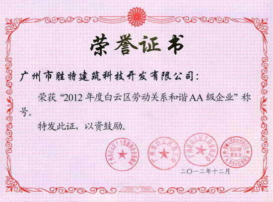 2012年12月31日晚,勝特加固公司應邀參加了由中國人民政治協商會議廣州市白云區委員會策劃,廣州市白云區人力資源和社會保障局、廣州市白云區總工會、廣州市白云區工商業聯合會(總商會)、廣州市白云區政協經濟科技委員會聯合主辦的2012年度白云區勞動關系和諧企業授牌儀式。我司代表先生在頒獎晚會上榮幸接受了“2012年度白云區勞動關系和諧AA級企業”的牌匾及證書。