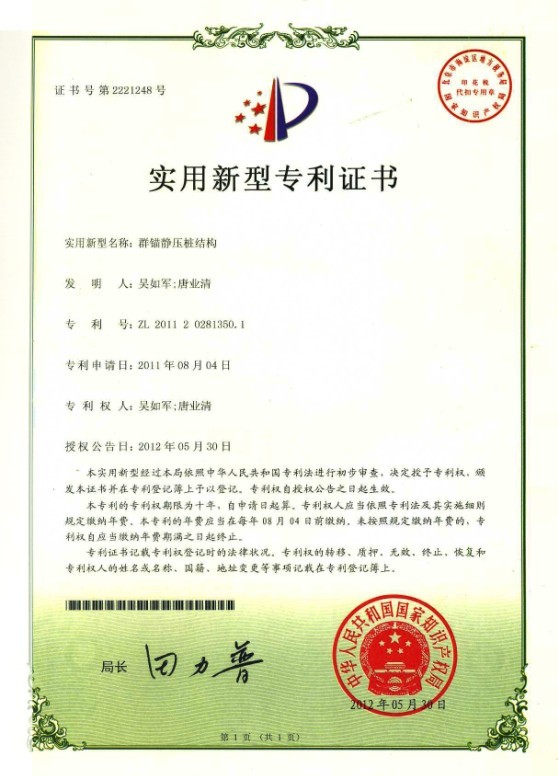 由公司董事長吳如軍先生、公司顧問唐業清教授共同發明的專利“群錨靜壓樁結構”于5月30日獲國家知識產權局授權。