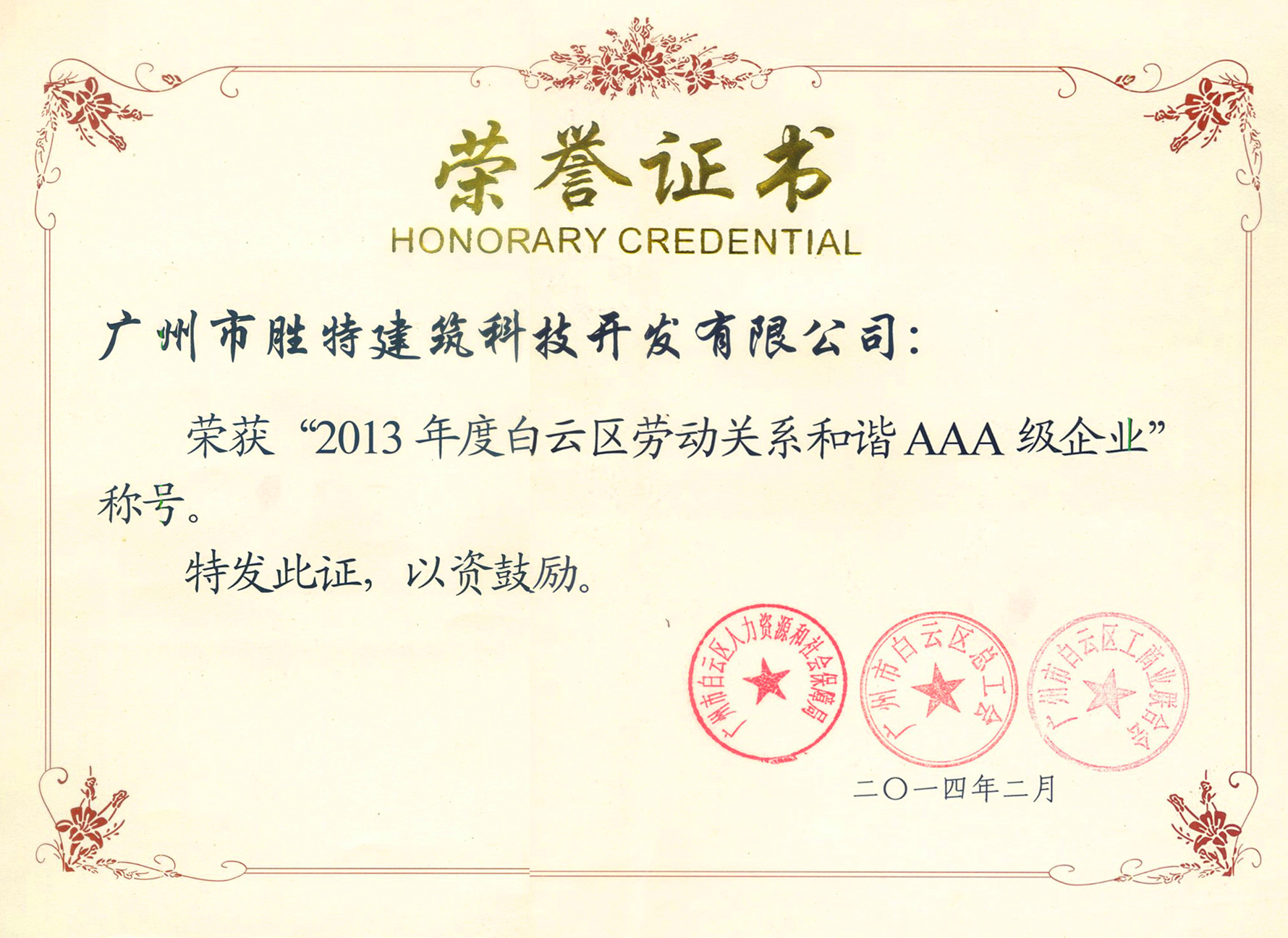 自1998年成立以來,勝特加固公司一直非常重視企業與員工的和諧發展,并于2011年正式成立工會。此次獲“2013年度白云區勞動關系和諧AAA級企業”榮譽證書是董事會領導的鼎力支持和工會成員的努力成果。