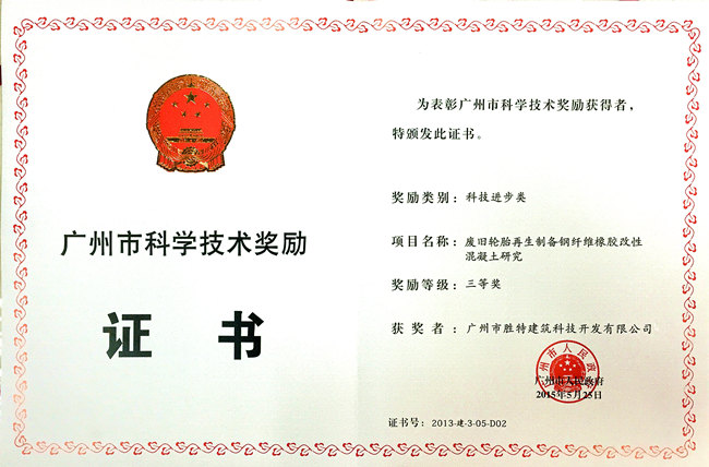 勝特建筑加固公司和廣東工業(yè)大學(xué)產(chǎn)學(xué)研合作申報(bào)的“廢舊輪胎再生制備鋼纖維橡膠改性混凝土研究” 獲頒2013年度廣州市科學(xué)技術(shù)三等獎(jiǎng)。董事長吳如軍先生、副董事長曾春航先生作為主要完成人對(duì)本項(xiàng)目進(jìn)行了研究與工程應(yīng)用。