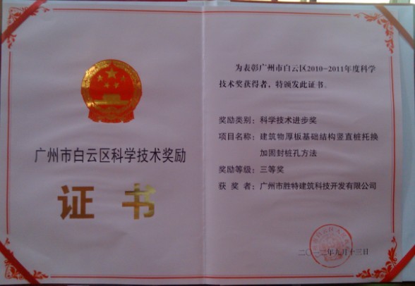 吳錦明副區長首先總結了全區2010-2011年度科技和信息化的工作情況;區委常委、常務副區長鐘向東宣讀了授予廣州市勝特建筑科技開發有限公司“建筑物厚板基礎結構豎直樁托換加固封樁孔方法”等20個項目廣州市白云區2010-2011年度科學技術獎的表彰通報;省、市科技部門領導和區五套班子有關領導親自向獲獎單位頒發白云區2010-2011年度科學技術獎,我司董事長兼總經理吳如軍等代表依次登臺領獎,勝特建筑加固憑借雄厚的技術實力、豐富的工程案例,獲此殊榮是實至名歸。
