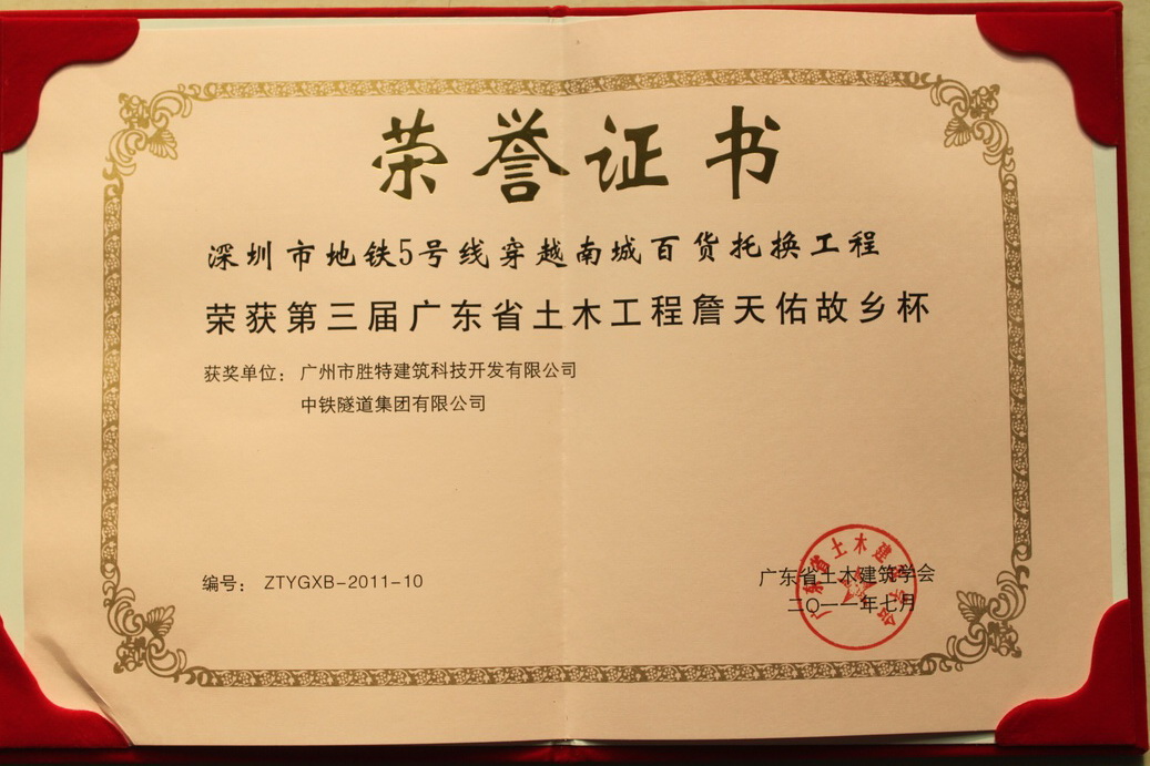 我司董事長吳如軍先生代表我司上臺領(lǐng)獎,接受了的廣東省土木建筑學(xué)會隆重表彰和嘉許。深圳5號線穿越南城百貨托換工程中克服了交叉干擾、技術(shù)、工期等難題,讓工程圓滿竣工,受到上級、廣大同行的肯定。此次獲獎將會鞭策我司再接再厲,作出新的成績。