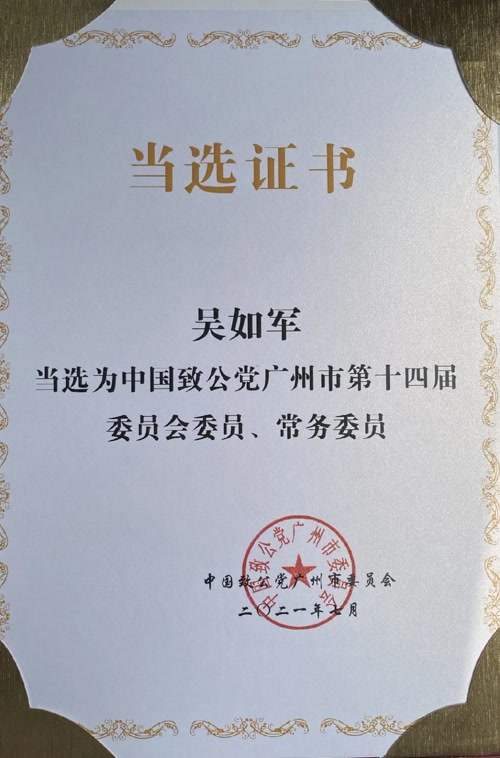 此外,今年8月31日中國致公黨廣州市委員會在廣州召開中國致公黨廣州市第十四次黨員代表大會,吳如軍董事長當選中國致公黨廣州市第十四屆常務委員會委員、常務委員職務。