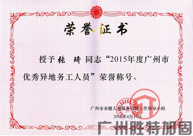 據了解,市共通報表彰確定的2015年度優秀異地務工技能人才150名、優秀異地務工人員50名、異地務工人員工作先進集體50個。廣州市勝特建筑科技開發有限公司辦公室主任張琦先生榮獲“2015年度廣州市優秀異地務工人員”榮譽稱號。