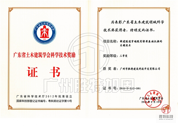 日剛發喜報,今天又奏佳音。由我司和廣東省輕紡建筑設計院聯合申報項目“新建隧道穿越既有橋梁基礎托換的關鍵技術”榮獲2016年度廣東省土木建筑學會科學技術獎。在已經進行的四屆評選中,我司連續獲得2項二等獎,2項三等獎。