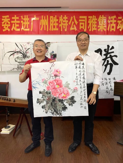 參加本次活動的有廣東楹聯(lián)學(xué)會書畫院執(zhí)行院長孫幼明,廣東楹聯(lián)學(xué)會書畫院副院長兼楷書委主任李賜麟,廣東楹聯(lián)學(xué)會書畫院組聯(lián)部副部長朱雪娟,拓展部副部長湯啟聯(lián),貝剛,青聯(lián)委主任謝曜徽,楷書委主任助理鐘振勇、楷書委副主任陳葦塘、省市美協(xié)會員聯(lián)絡(luò)組副主任劉肖貞,牡丹畫研究會主任助理熊志君及書法家鄒媚,趙振威,劉佑華,梁儉宏,湯榮焜等近20人。吳董事長是貴州畢節(jié)人,廣東省畢節(jié)商會會長、廣州勝特建筑科技公司董事長、廣州市致公黨第十四屆委員會市委常委、廣州白云區(qū)第九屆政協(xié)委員、第十屆政協(xié)常委、廣州市第十五屆人大代表、廣州白云區(qū)第十七屆人大常委、廣州市工商聯(lián)書畫家協(xié)會副會長......1994年從北京來到廣州,從建筑維修防水補(bǔ)漏開始創(chuàng)業(yè),發(fā)展了20多年事業(yè),紅紅火火,越做越大,通過技術(shù)創(chuàng)新,在建筑物加固改造、托換與糾傾、平移領(lǐng)域方面技術(shù)研發(fā)很有創(chuàng)新與取得驕人的成績,為廣州的城市建筑的保護(hù)與修繕加固作出了巨大的貢獻(xiàn)。