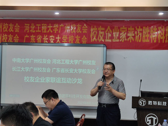 8月26日,由中南大學廣州校友會、長江大學廣州校友會、河北工程大學廣州校友會、廣東省長安大學校友會四校校友會聯合舉辦的"四所高校校友建筑行業專家、企業家聯誼互動沙龍”在廣州市勝特建筑科技開發有限公司人才培訓中心成功舉辦。活動采用線下+線上直播相結合方式,線下數十位不同領域的建筑行業專家、企業家校友參會,線上近1000人在直播間觀看。