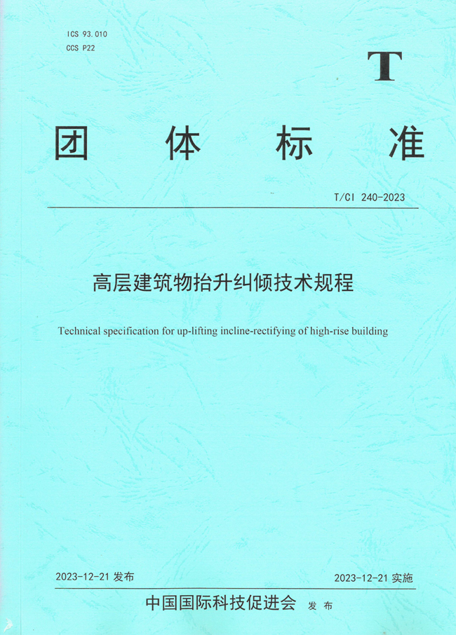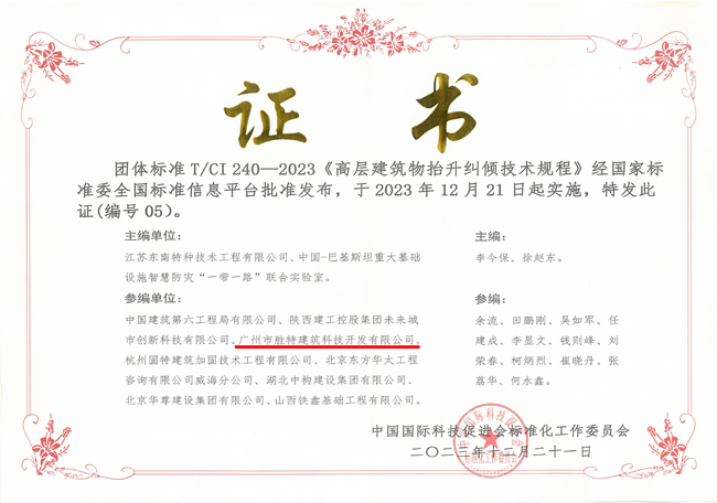 2023年12月21日,由江蘇東南特種技術工程有限公司和科技部中國-巴基斯坦重大基礎設施智慧防災一帶一路聯合實驗室共同主編、我司參編的團體標準《高層建筑物抬升糾傾技術規程》(編號為T/CI 240-2023)(以下簡稱《本規程》)經國家標準委全國標準信息平臺批準順利發布。