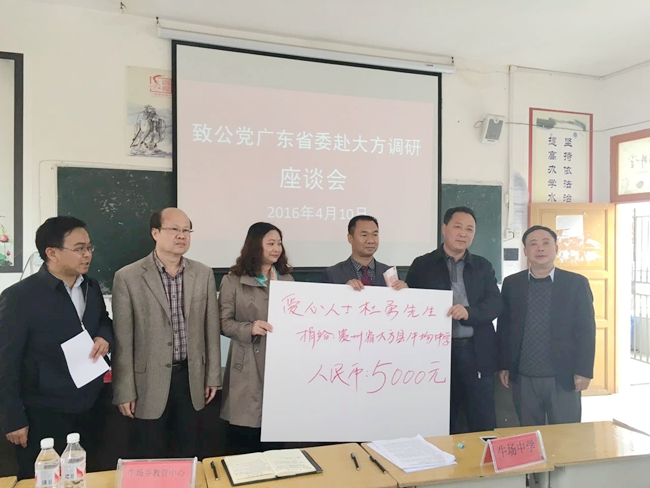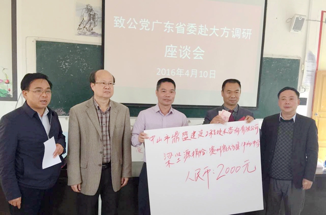 會上,我司董事長吳如軍先生帶頭向大方縣捐贈2萬元,農工黨中山市委會黨員、廣東固易特種工程有限公司董事長李同群先生捐贈1萬元,熱心人士杜勇先生捐贈5000元,中山市鼎盛審圖公司總經理梁堅源先生捐贈2000元;整個捐贈活動,調研組共向大方縣牛場中學捐贈3.7萬元,用于孤兒及單親家庭貧困孩子助學用途。