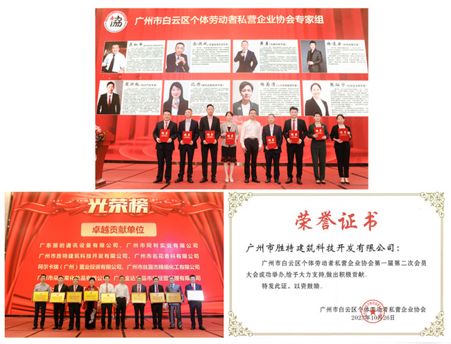 在本次會議中,我司吳如軍董事長被聘為“廣州市白云區(qū)個體勞動者私營企業(yè)協(xié)會建筑加固改造與病害處理專家”;在表彰環(huán)節(jié)中,我司獲得“廣州市白云區(qū)個體勞動者私營企業(yè)協(xié)會卓越貢獻(xiàn)單位”等榮譽(yù)稱號。