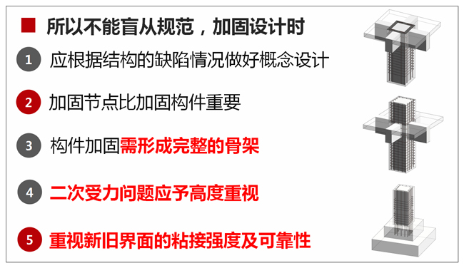 所以我們不能盲從規(guī)范,加固設計時,應注意以下幾點: